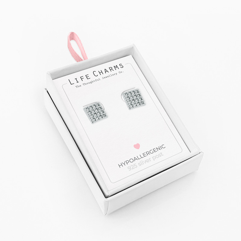Square silver plated stud earrings with cz stones.