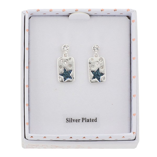 Add a touch of celestial sparkle to your look with these stunning Blue Star Silver Plated Drop Earrings. Each earring features a rectangular silver-plated design adorned with clear crystals and a dazzling deep-blue star at the centre, catching the light beautifully from every angle. Perfect for both everyday wear and special occasions, these earrings bring a modern, cosmic twist to classic sparkle. Presented in a lovely gift box, they make a thoughtful present for someone special — or a little treat for yourself!