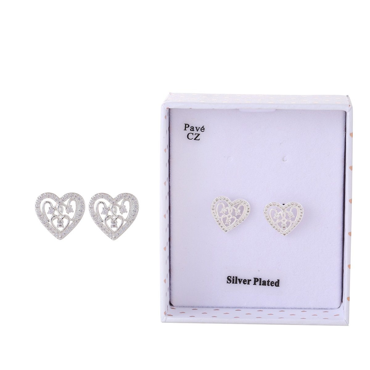 Equilibrium silver-plated heart earrings with hugging hands in a glass gift bottle