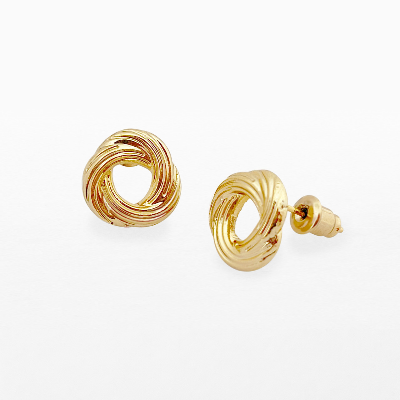 Knot gold plated stud earrings. Hypoallergenic. Earrings measure: 13 mm diameter. Come presented on silver foiled card in a luxury hanging box.