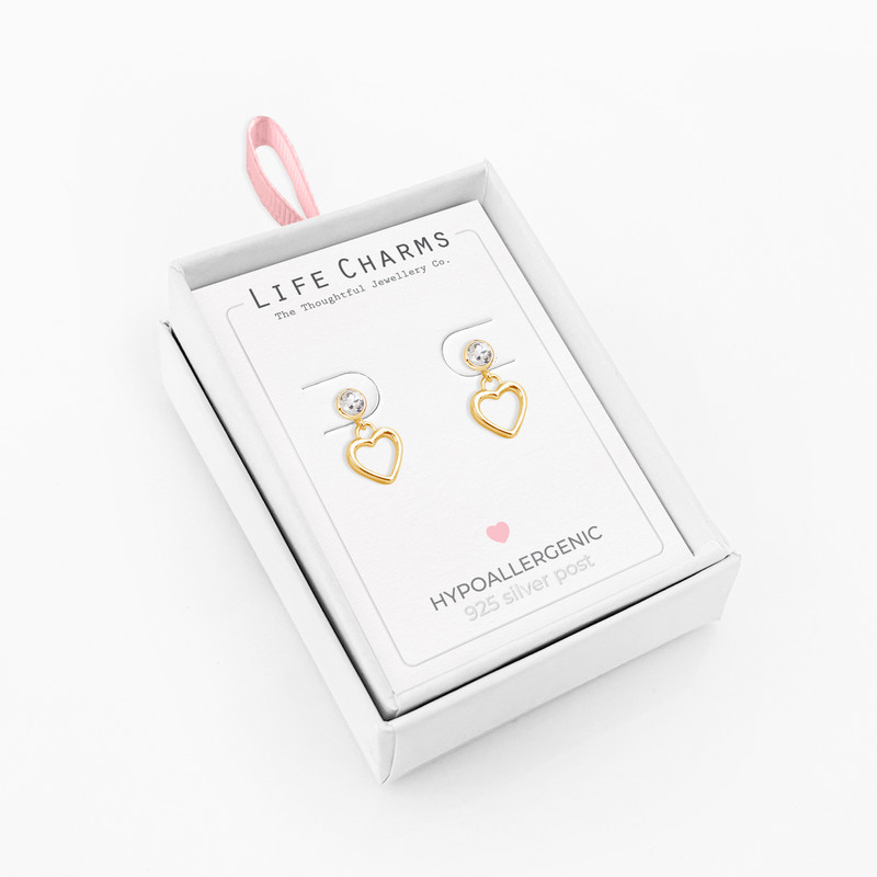 Gold drop hearts with cz stone. Hypoallergenic. Earrings length: 24 mm. Come presented on silver foiled card in a luxury hanging box.