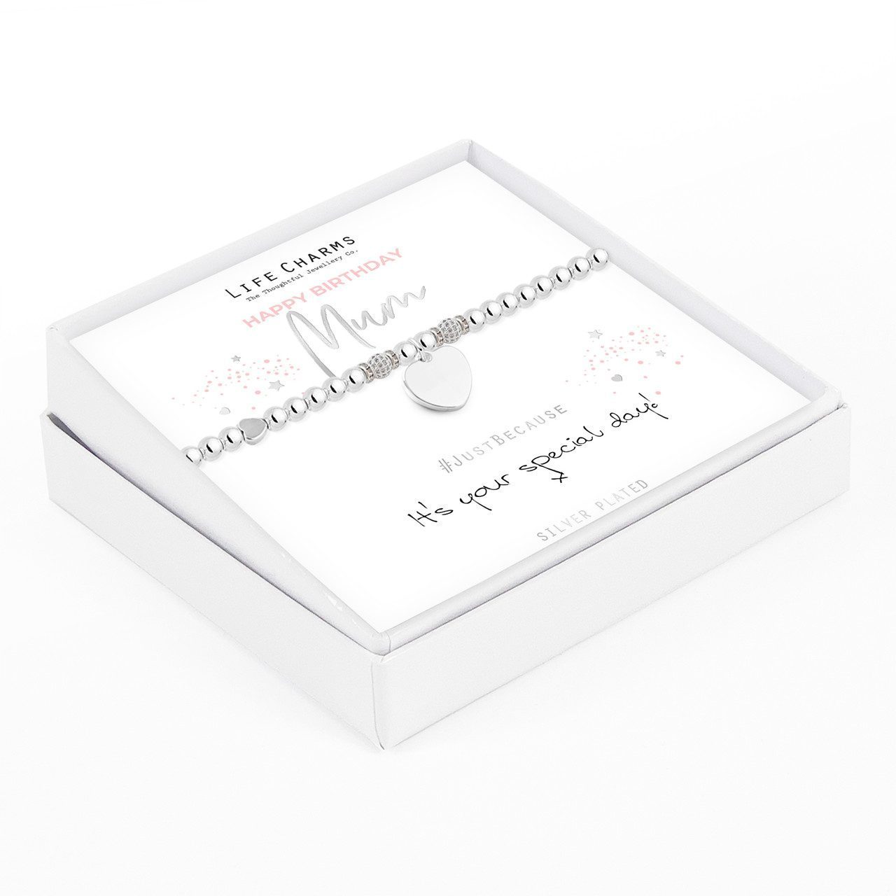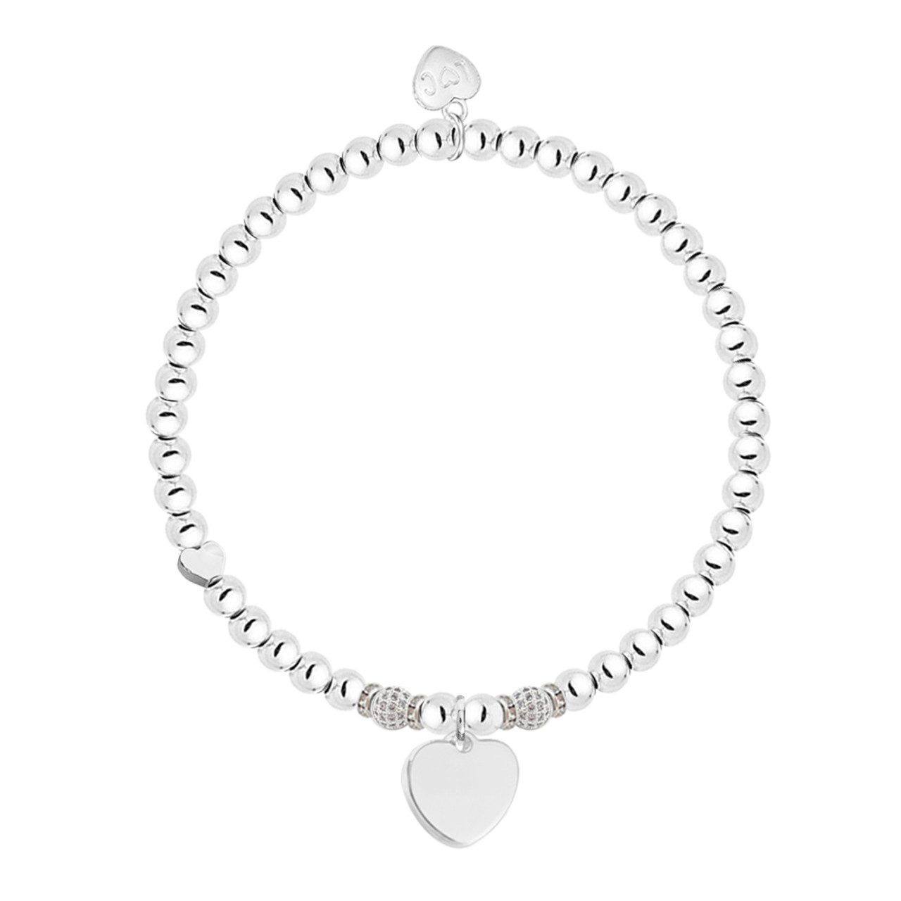 Featuring silver plated elastic bracelet with crystal beads, rondelles between them and flat hanging heart charm.
