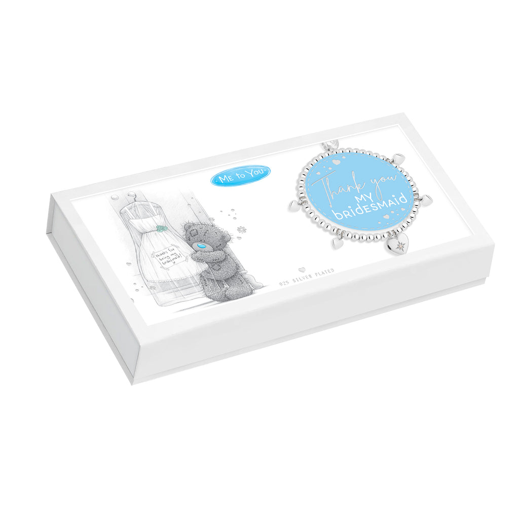 New for 2026 limited-edition range inspired by Me to You’s signature themes. Beautiful 5 mm beaded bracelet crafted from the finest 925 silver-plated beads adorned with a sparkling rondelles and hearts charms. Presented on a sentiment card with inspiring message "Thank you my Bridesmaid" alongside adorable Me to You wedding theme. Nestled in an elegant white gift box ready for gifting. The bracelet measures 17.5 cm and offers gentle stretch for a comfortable fit. Gift box size 20.5x10.5x2 cm. A truly thoughtful gift for someone special you love and care about.