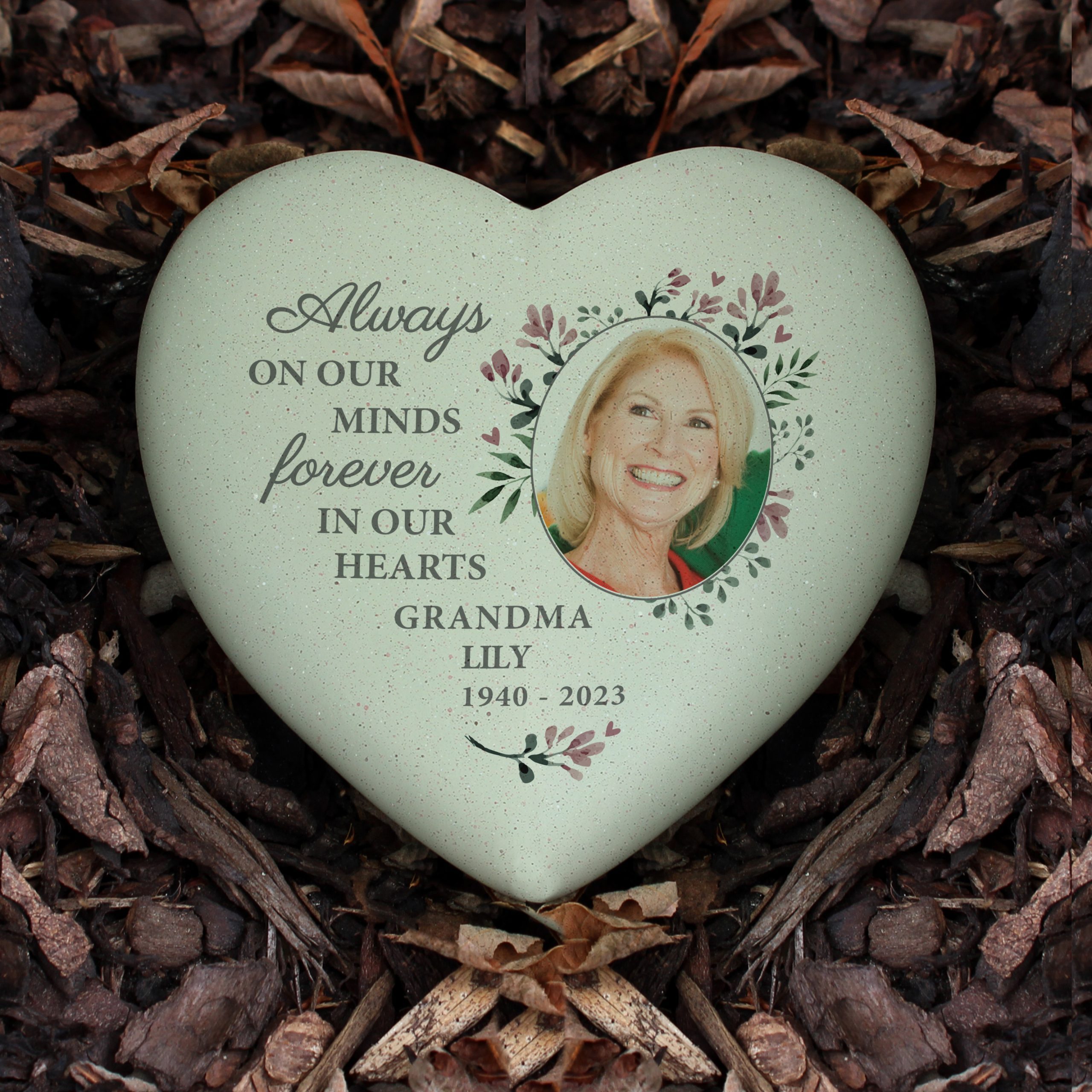 Personalise this Personalised Floral Photo Upload Memorial Resin Heart with a photo of your choice and a message over 3 lines, each up to 20 characters long.