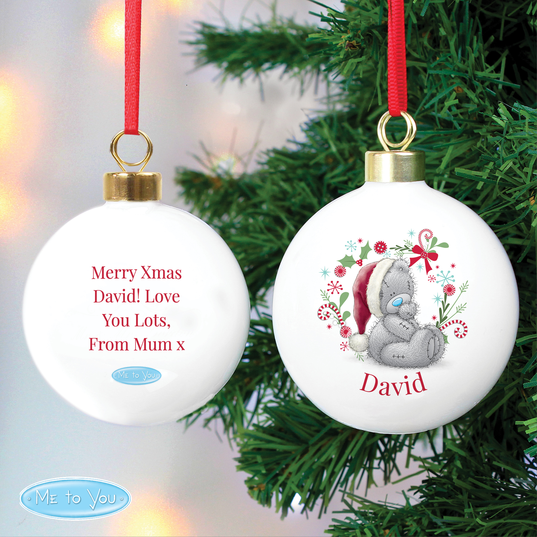 Personalise this Me To You Christmas Bauble with name up to 12 characters on the front and a message to the back over 4 lines of 20 characters per line.