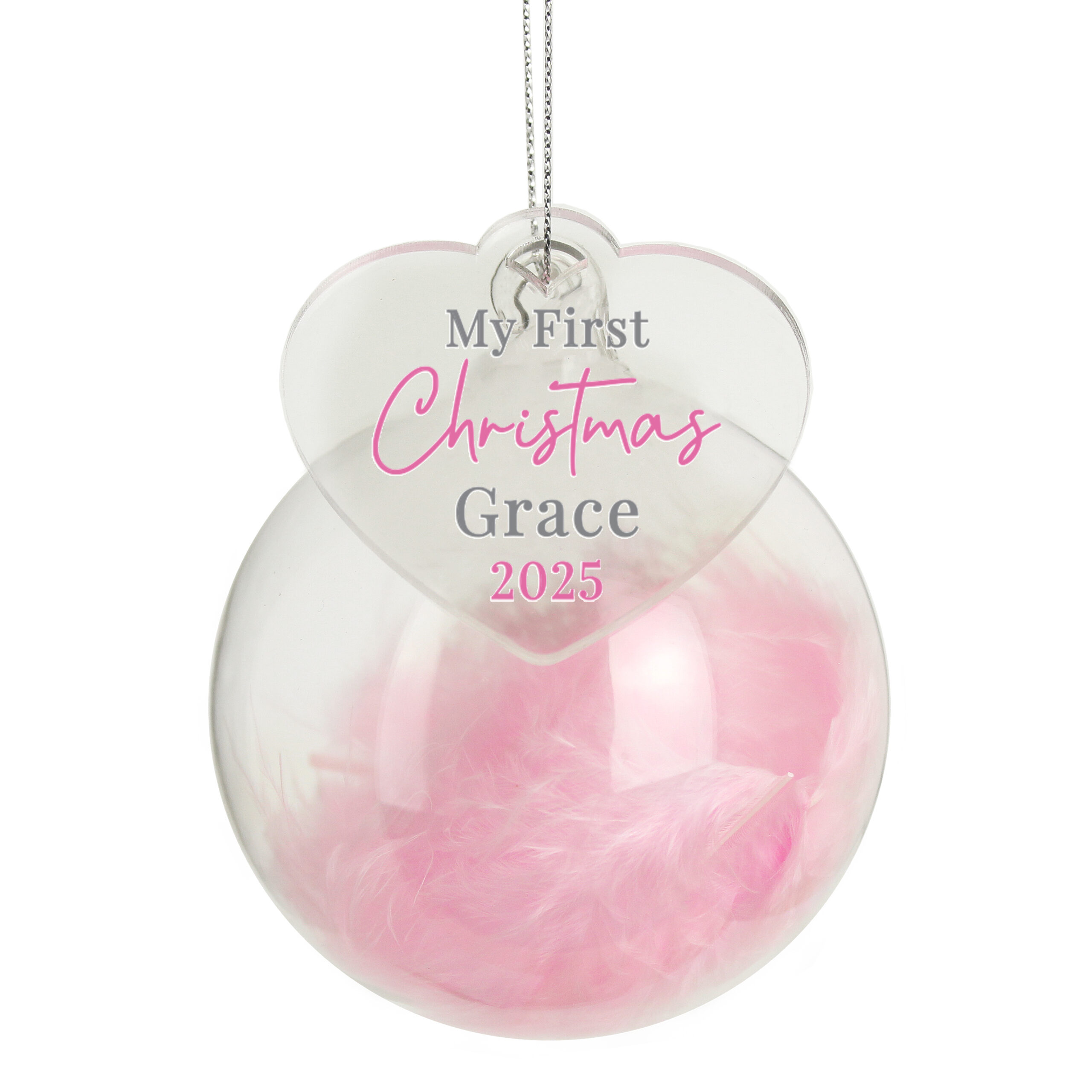 This feather glass bauble with heart tag will make a stunning addition to the Christmas tree for baby's first Christmas.